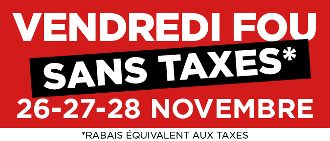 Obtenez un rabais équivalent aux taxes sur tout en magasin les mercredi 26, jeudi 27 et vendredi 28 novembre.